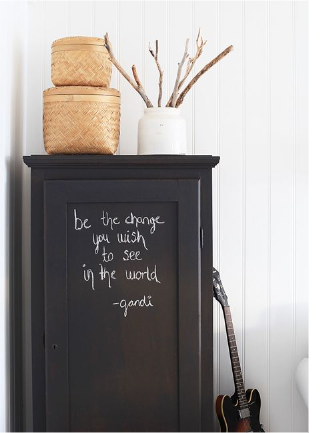 В квартире-студии невысокий шкаф, покрытый грифельной краской, поможет разделить пространство на зоны. Используйте его как перегородку и одновременно как поверхность для рисования. Меловой шкаф для зонирования – это стильное и практичное решение.