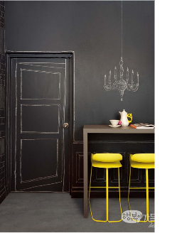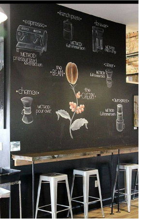 Напомним, что меловая поверхность необязательно должна быть черной. Вы смело можете интегрировать в интерьер любой выбранный вами оттенок. Грифельная краска колеруется по запросу и предпочтениям, вам только требуется указать в заказе номер цвета из палитр RAL или Tikkurila.